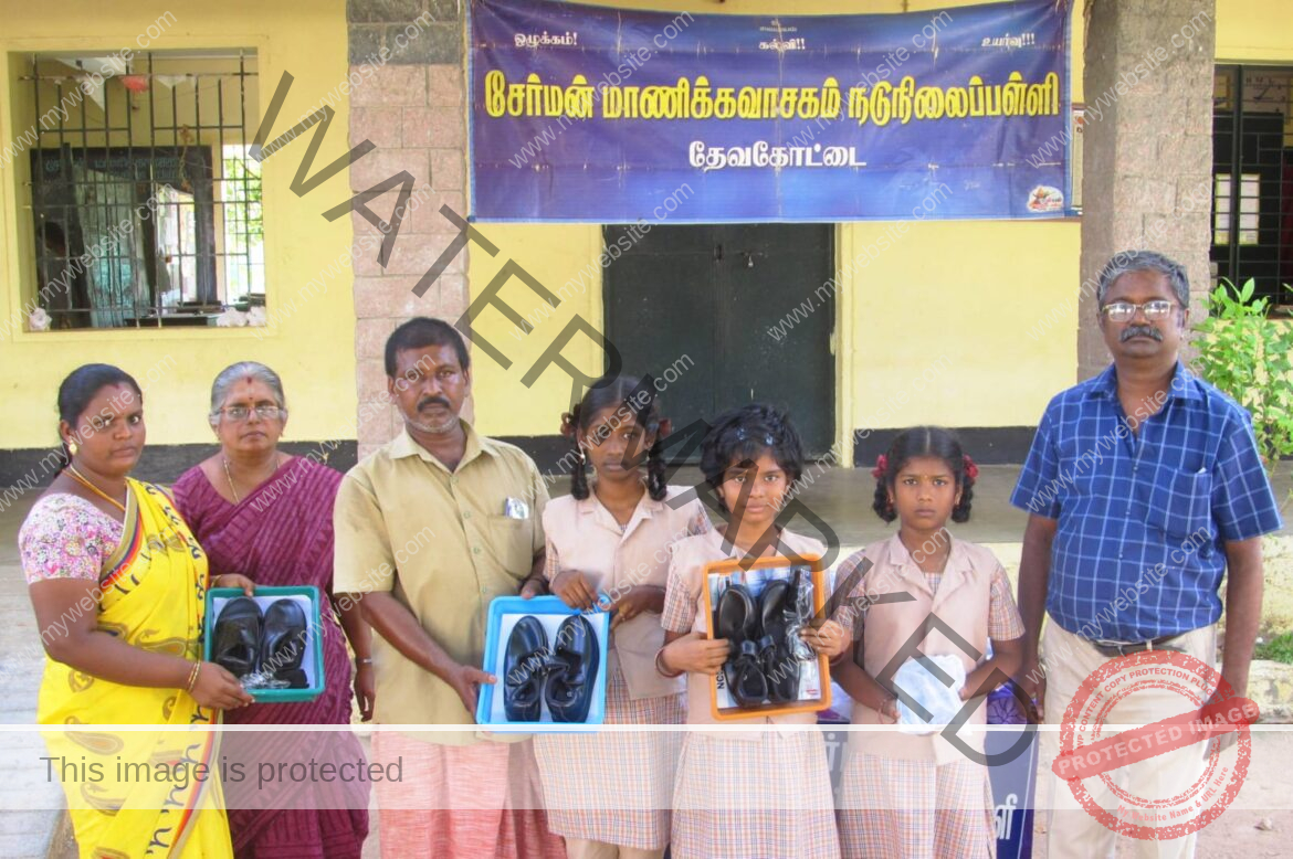 சிவகங்கை மாவட்டம், தேவகோட்டை சேர்மன் மாணிக்க வாசகம் நடுநிலைப் பள்ளியில் தமிழக அரசின் இலவச காலணிகள் மற்றும் ஷீக்கள் பள்ளி மாணவர்களுக்கு வழங்கியுள்ளனர்.
